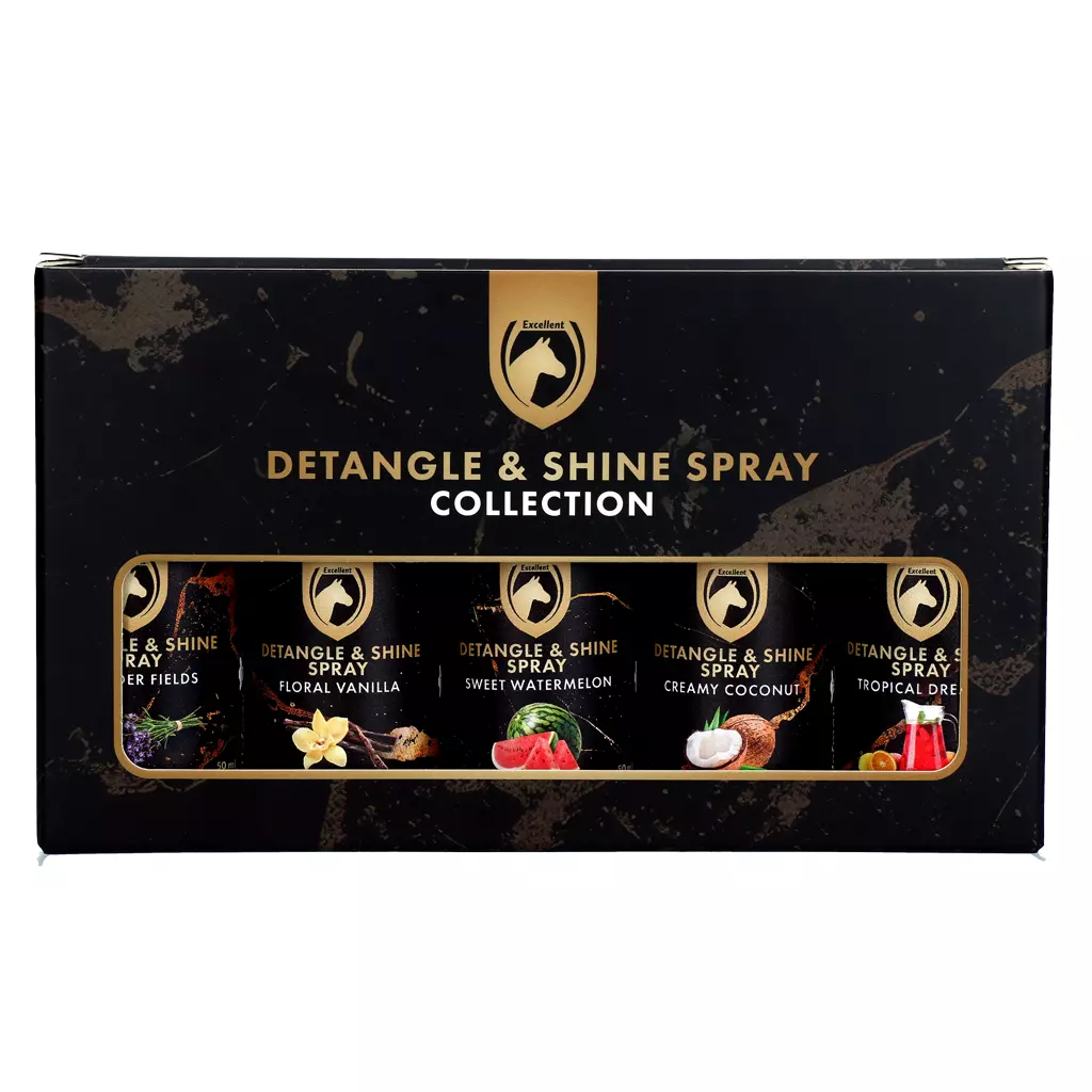 De Excellent Horse Detangle & Shine Spray geschenkset bevat vijf sprays van 50 ml in verschillende geuren: Creamy Coconut, Floral Vanilla, Sweet Watermelon, Lavender Fields en Tropical Cocktail.
